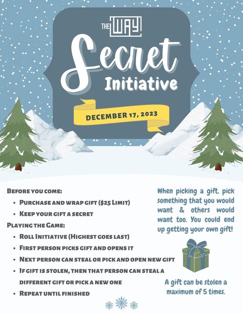 Bring a friend for The Way Christmas Party on December 17th at 5:00 PM-8:00 PM! We'll have food, hot chocolate, candy cane wars, saran wrap balls, and a Secret Initiative Gift Exchange. Check out the info below for the gift exchange. We'll see you there!